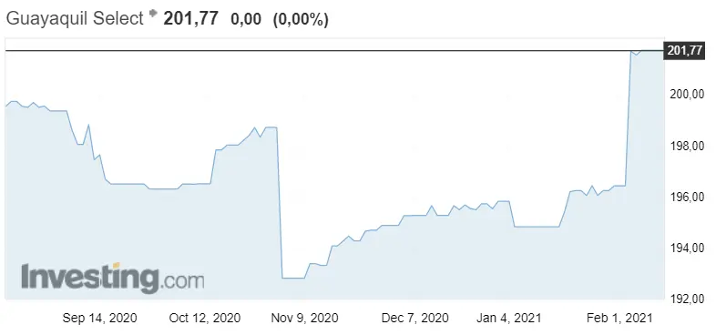 Como vemos en el gráfico de abajo, las cotizaciones del índice Guayaquil se mantienen en la cima durante los últimos días, que son los iniciales del mes de febrero, con una situación actual de 201.77 puntos. Lo que iba sucediendo desde hace un tiempo era una situación en la que de los 192.82 puntos el índice subía hacia los 201.77 que se va manteniendo desde el 3 de febrero. ¿Para cuándo debemos esperar algún tipo de reacción por parte del índice ecuatoriano?