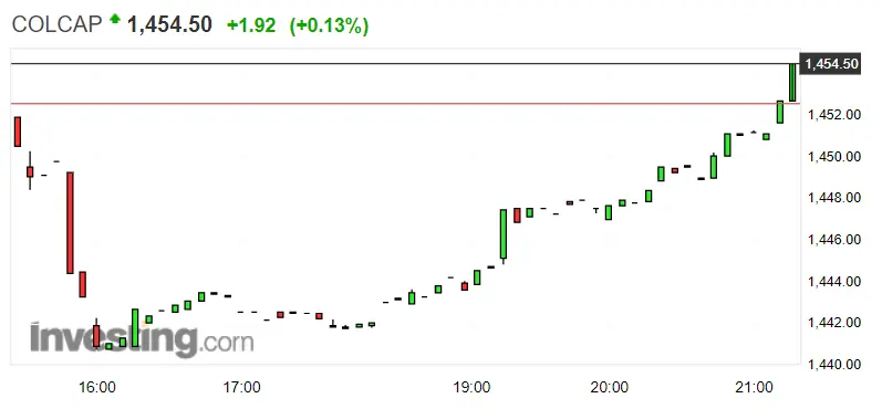 El verde nos señala lo intesas que son las subidas del momento actual en el índice colombiano COLCAP. Actualmente se trata de ascensos de unos 1.92 puntos, lo que traducimos en un 0.13% dejando las cotizaciones del COLCAP en unos 1454.50 puntos. Si nos centramos en los puntos de soporte y resistencia, veremos como el nivel de soporte baja hasta unos 1440.64 puntos, mientras que el nivel de resistencia lo fichamos en unos 1452.76 puntos. Éramos testigos también del salto que pasaba de los 1443.33 a unos 1442.27 puntos.