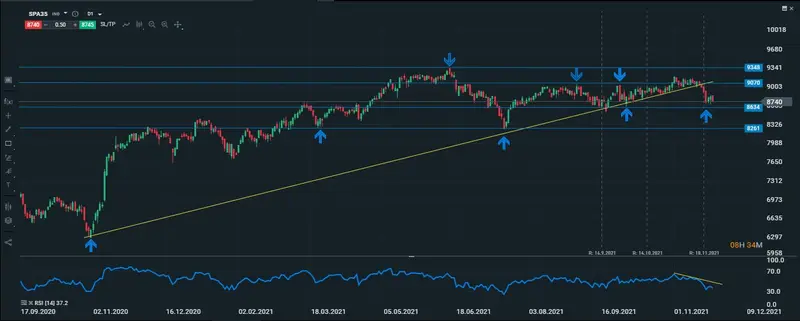 Pero dichas subidas ahora se han convertido de pronto en pequeñas correcciones, que de momento no han roto los suelos que se encuentran en los 8634 puntos, lo que de momento da alas para que al menos el índice no se encuentre realizando correcciones fuertes. Dicho esto mantenemos nuestros puntos de cambio de tendencia en el caso de un movimiento alcista, si el precio rompe los techos que se encuentran en los 9197 puntos, hasta no ver superado estos techos, no nos posicionaremos alcistas, más si por el contrario el precio rompe los suelos que antes hemos comentado, entonces los siguientes suelos que nos tienen que importar son los que se encuentran en los 8261 puntos.