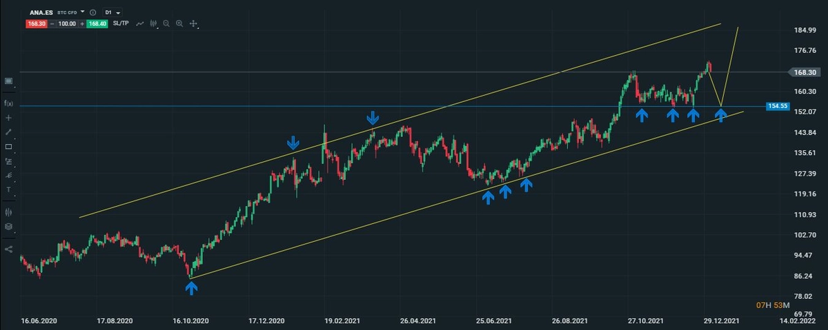 ¿Cómo sabremos de que el precio podría seguir cayendo? En el gráfico de la compañía observamos que los suelos más próximos se encuentran en los 154 puntos, nivel al que le deberíamos tener mucha consideración, porque de romper el precio dichos suelos, sería nuestra señal que nos indicaría de que el movimiento correctivo va en busca de testear la línea que une sus mínimos crecientes. Lo que esperamos que suceda después es que el precio de la acción respete dicha línea para a partir de aquí vuelva a su senda alcista, que llevaría al precio a generar nuevos máximos en la valoración de la acción de la compañía. De momento solo tendremos que estar atentos a ver si el precio llega a testear los suelos que se encuentran en los 154 puntos, si lo que buscamos es posicionarnos alcistas en la compañía.