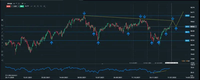 Por otro lado, si el precio del índice no llegase a detenerse sobre los 8850, podríamos esperar que el precio del índice ahonde su movimiento correctivo hasta los siguientes suelos que se encuentran en los 8617 puntos, en principio no esperamos que esto suceda ya que de momento no notamos un cambio en la estructura del gráfico así como de nuestro indicador el RSI, por lo tanto, primero veremos que pasará cuándo el precio llegue a testear la línea que une sus máximos decrecientes para ver si se da algún cambio en la estructura del gráfico.