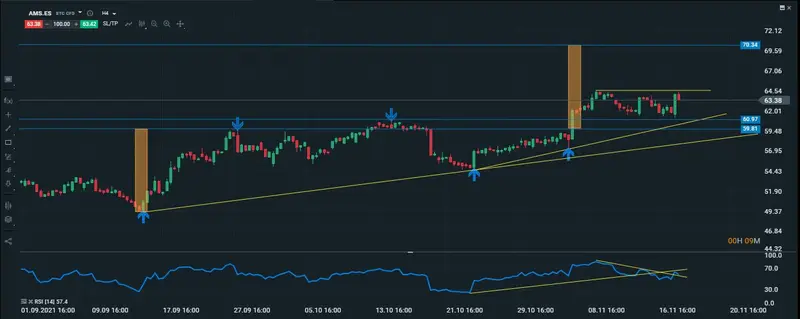El Holding tecnológico más conocido como Amadeus, es la compañía que viene realizando un buen desempeño en el índice español, si nos vamos a su gráfico intradiario veremos que en la estructura del gráfico tenemos una formación de mínimos crecientes y de máximos al mismo nivel, lo que se podría considerar como una formación triangular, que se confirma con la rotura del mismo por la parte superior a principios de este mes, lo que significaría que se podrían estar dando revalorizaciones en el precio de la acción hasta los 70 puntos o lo que vendría a ser igual un aumento del 17% en el precio de la acción. Infortunadamente, no todo son buenas buenas noticias, porque mientras miramos los movimientos alcistas en el gráfico de la compañía, vemos claras divergencias en el indicador del RSI, lo que significaría de que a lo mejor estemos a las puerta de posibles correcciones en el valor de la acción.