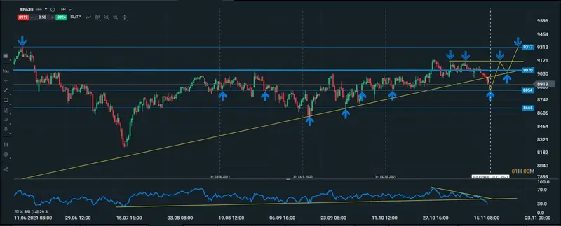 Sus siguientes suelos se encuentran en 8.854 puntos, luego vendrían sus suelos importantes que se encuentran en los 8.665 puntos, de llegar el índice a corregir hasta estos suelos estaríamos hablando de un 5% de pérdida en el valor del índice. Ahora bien, esta sería nuestra visión más pesimista para el índice, pero solo consideraremos esta opción en caso de que el valor del índice supere los suelos que se encuentran en los 8.854 puntos, de darse la situación de que el precio del índice se detenga sobre los suelos antes mencionados, lo que tendríamos que esperar que se de, es que los movimientos del índice den una clara señal de un cambio de tendencia, solo de esta manera podríamos cambiar nuestro sesgo bajista por uno alcista, tras confirmarse el cambio de tendencia consideramos de que los próximos movimientos del índice español serán los de ir a testear los techos que se encuentran sobre los 9.168 puntos, para luego volver a sufrir una pequeña corrección, pero que dicha corrección se detendría sobre la línea que une sus mínimos crecientes con la intención de que a partir de aquí el precio continue con su movimiento alcista hasta llegar a los techos que se encuentran sobre los 9.317 puntos.