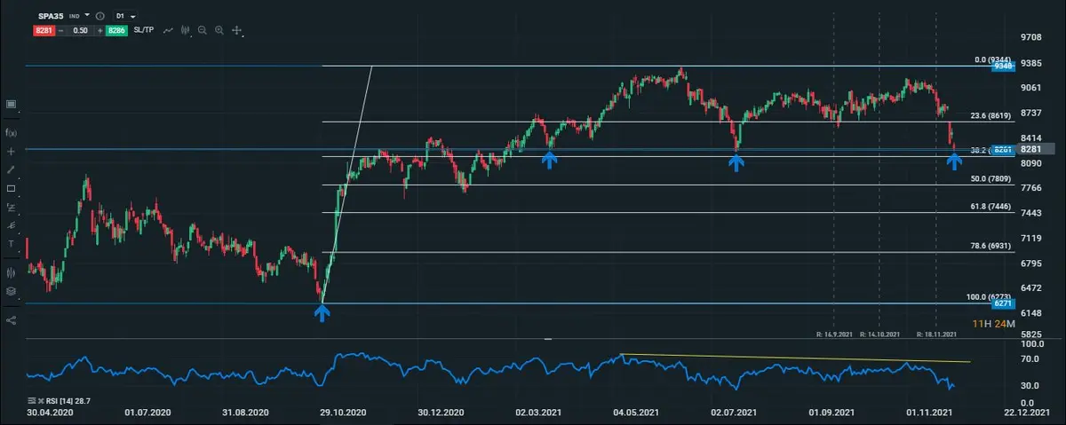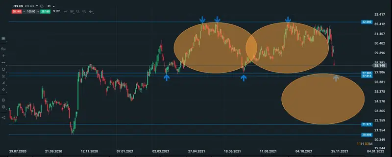 el día de hoy saltaba también la noticia del nuevo cambio en la directiva de la compañía de Amancio Ortega, ya que su hija Marta Ortega pasará a ser la mano fuerte que dirija la compañía que fundó su padre. Al parecer esto a afectado más que el simple hecho de que hay una nueva variante del virus, provocando que las caídas en la valoración de la acción de compañía ya ronda un 5.31%. Tras haber llegado a testear sus máximos que se encuentran en los 32 puntos, vemos que el precio de la acción ha sido lo de irse cuesta abajo, si miramos su gráfico diario, el precio se encuentra a punto de llegar a testear unos suelos muy importantes que se encuentran sobre los 27 puntos, lugar en el que esperaremos para ver si se dan los cambios de un posible movimiento alcista, o si por el contrario el precio decide seguir corrigiendo, de seguir con el movimiento correctivo, entonces se activaría ese gran doble techo que se ha formado en la estructura del gráfico de la compañía. Y que de confirmarse, las correcciones que sufriría el valor de la acción serían fuertes, ya que como se puede apreciar en el gráfico la corrección llevaría al precio de la acción a testear los suelos que se encuentran entre los 21 y 20 puntos, aproximadamente