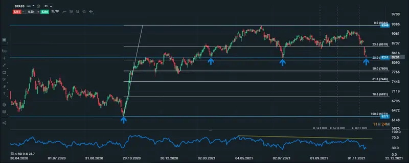 Si en cambio el precio del índice sí llega a detenerse sobre los suelos en los que se encuentra, entonces tendremos que esperar a las posibles señales que se vayan mostrando, para ver si los movimientos del índice nos invita a pensar de que lo peor ya ha pasado, y que ha llegado el momento de subir como la espuma, ya sabemos que se nos tienen que dar dos señales para que nuestra visión bajista se torne alcista, de momento tanto el price action, como el indicador del RSI, todavía no nos muestran posibles cambios de tendencia. Lo que nos indica de que las correcciones todavía no han terminado.