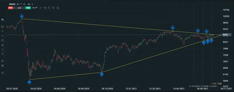 Si observamos la estructura del gráfico vemos que los máximos del índice son decrecientes, mientras que sus mínimos son crecientes, y si trazamos una línea uniendo los máximos y mínimos vemos que ambas líneas se juntan en unos techos que hasta por el momento al precio del índice le ha resultado díficil de superar.