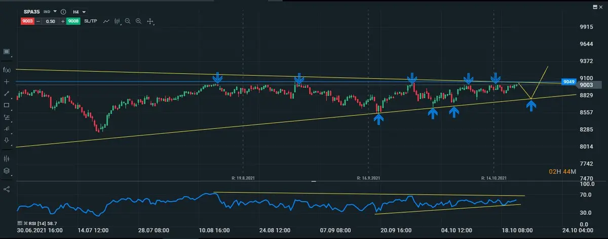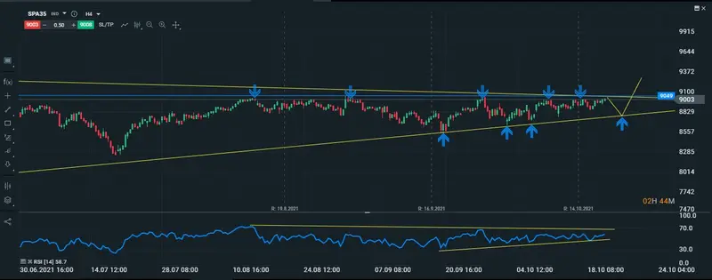 ¿Pero hay posibilidades de que esta vez el Ibex logre superar dichos techos?, para que se confirmen las roturas de los techos que se encuentra en los 9042puntos, primero tendríamos que ver en el indicador del RSI, superar la línea de máximos decrecientes que se ha venido formando desde agosto de este año, los mínimos crecientes que se pueden apreciar en el RSI, nos dan a entender de que hay buenas posibilidades de que el precio del índice logre superar los techos de la discordia.