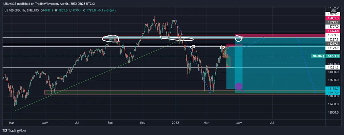 El índice del Nasdaq ha caído aproximadamente un 10%, aunque alcanzo un poco más del 20% comenzando el mes de marzo, lo cual muestra un rebote y una recuperación de esa caída del 10% y ha sido una recuperación muy rápida, también ayudada por la relajación del conflicto entre Rusia y Ucrania en los últimos días, con subidas de tipos de interés y una posible ralentización de la economía esos rebotes que tienen los índices son más atractivos para que la gente se posicione en corto, además que en china otra vez se está con problemas de covid y se le está saliendo de control la gestión , esto afecta la economía mundial, ya que la gran mayoría de empresas tienen manufactura de ese país por sus bajos costos , un ejemplo es la marca Apple que se está viendo afectada por el cierre temporal de algunos proveedores.