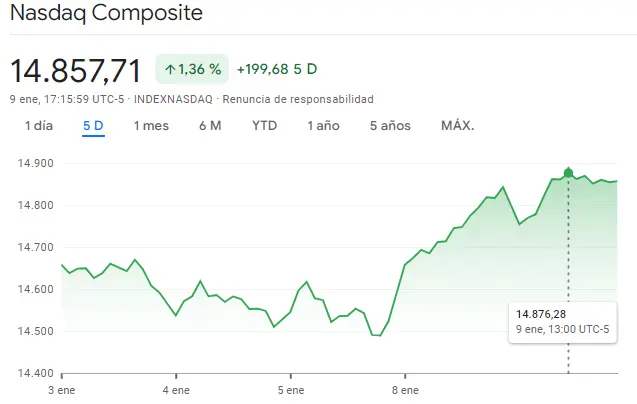 La semana ha sido más interesante de lo que podíamos esperarnos del índice Nasdaq 100 con sus cambios de tendencia que van de unos valores bajos a otros mucho más fuertes como los que hemos encontrado en el máximo de unos 14876.28 puntos. En cuanto a los máximos, los de caída los hemos llegado a apreciar en valores de unos 14500 puntos por el índice estadounidense. Ahora mismo el Nasdaq 100 cotiza unos 14857.71 puntos, subiendo unas cotizaciones de unos 199.68 puntos, creciendo un porcentaje del 1.36%.