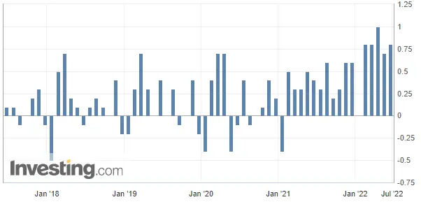Hoy miércoles 22 de junio se publicaba la tasa de inflación mensual en Canadá alrededor de las 14:30 horas. Las estimaciones de 0,4% en mayo se vieron superadas por una subida del 0,8%.