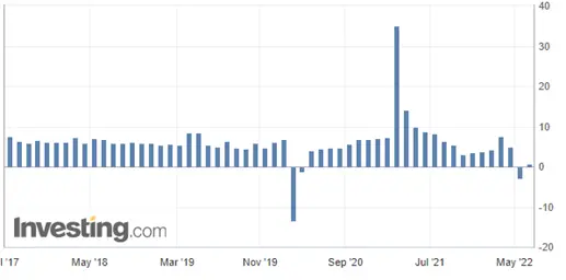 La producción industrial se encarga de medir los posibles cambios en todo lo que se produce en fábricas, minas y empresas. Es un buen indicador para medir la fuerza del sector industrial y también promediar las ganancias e ingresos del sector. Normalmente el crecimiento se verá como algo positivo, y el decrecimiento como algo negativo para la economía. En el mes de abril los resultados de producción industrial fueron muy malos ya que se esperaba un crecimiento del 0,4% y se obtuvo un -2,9%, pero este mes ha ocurrido al revés. En la gráfica se puede observar lo que aumenta China prácticamente cada año, suele estar rondando el 5%.