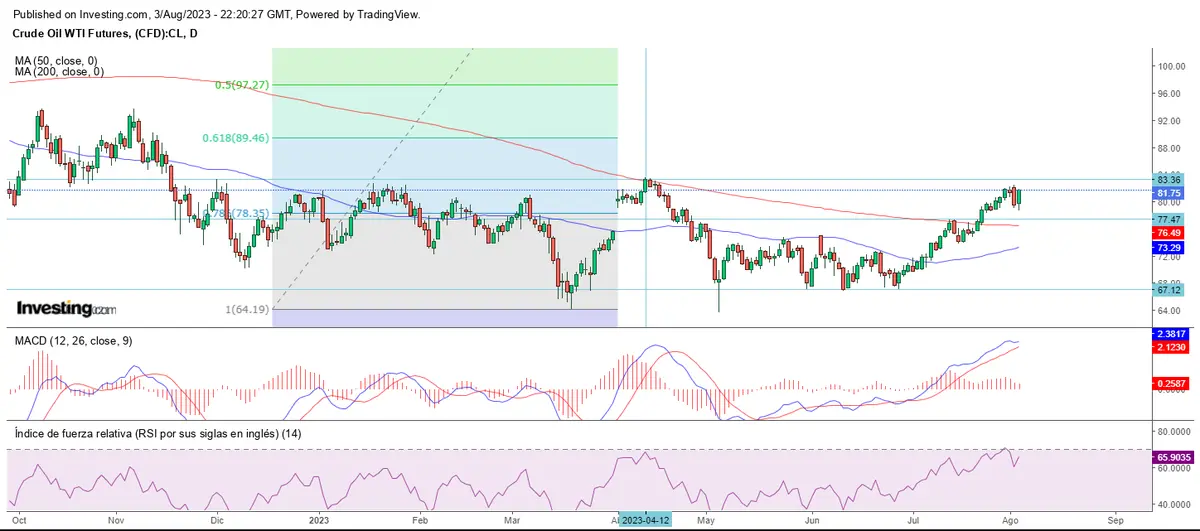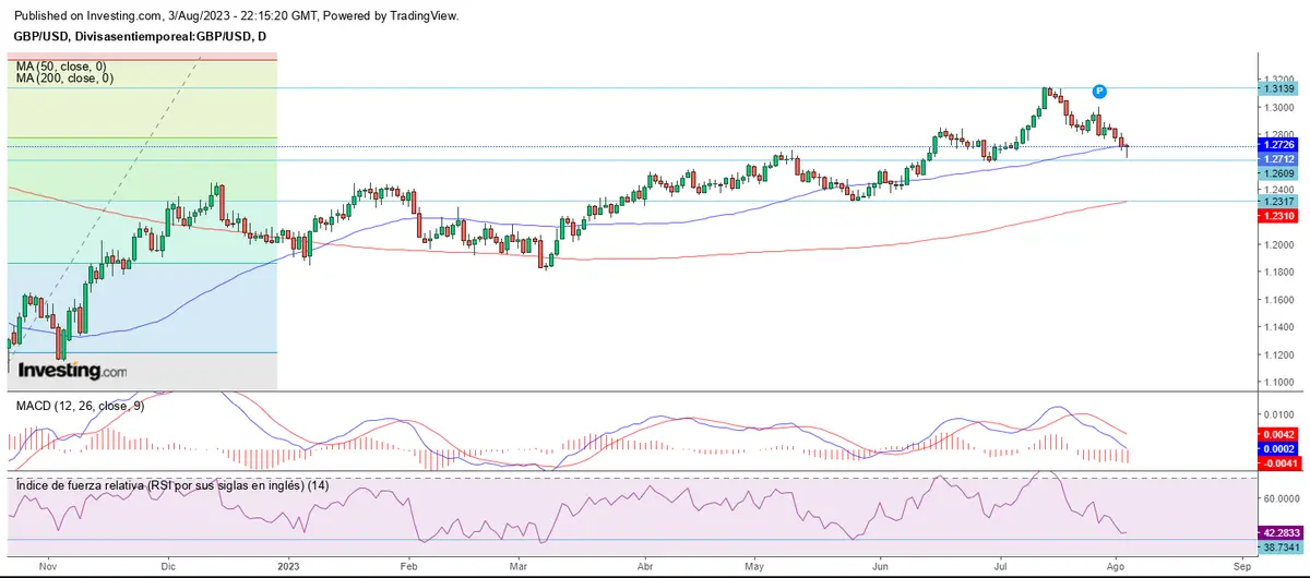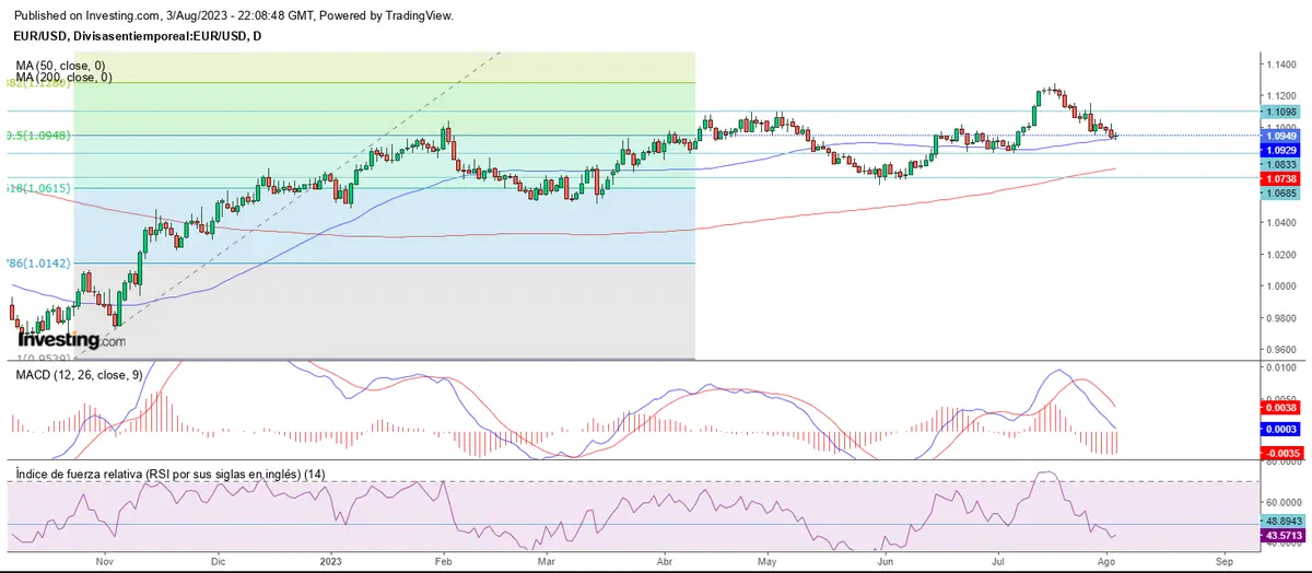 La media móvil de 50 se encuentra encima de la vela del viernes, RSI plano en los 42 puntos y la línea rápida (azul) del MACD apenas por encima del nivel de cero.