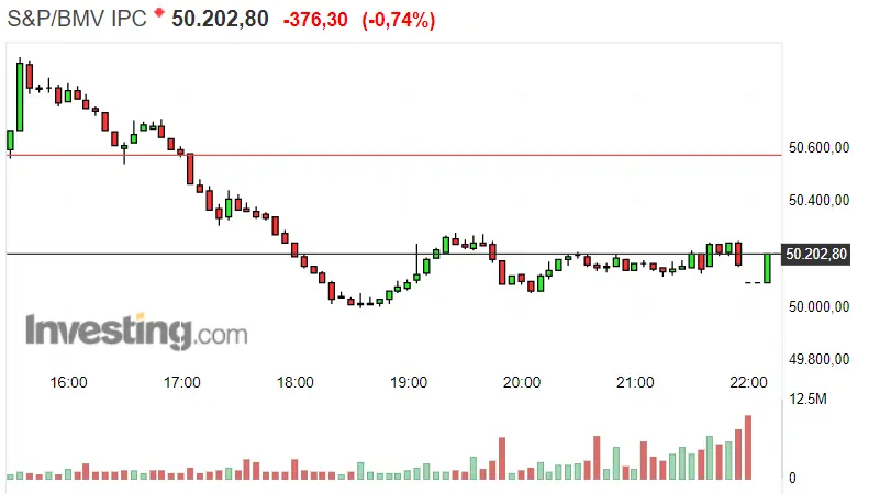 Vemos niveles de soporte y resistecia propios del índice mexicano S&P/BMV IPC bastante dispersos aunque las cotizaciones del momento actual se encuentren más próximas al nivel de soporte que al de resistencia. El nivel de resistencia lo vemos en 50945.21 puntos, mientras que el de soporte lo encontramos en 49997.28 puntos. Si nos fijamos en lo que está sucediendo en el momento actual, veremos una bajada de 0.74% que desciende unos 376.30 puntos, dejando la bolsa mexicana en rojo. Por tanto, las cotizaciones del momento actual permanecen en 50202.80 puntos.