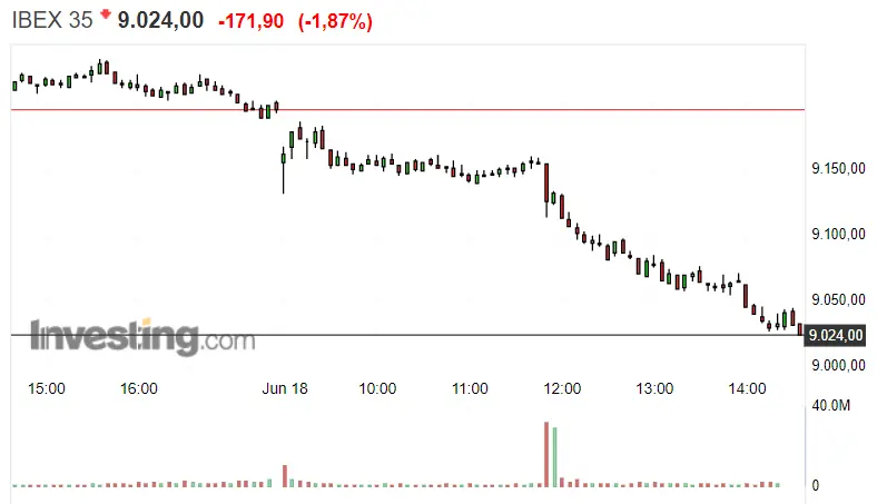 Tal y como adelantamos en el título, el índice español Ibex 35 se profundiza en una bajada dejando las cotizaciones del momento actual en unos 9024 puntos, es decir, la bajada hasta el momento actual de la que hemos sido testigos ha sido la de unos 171.90 punto; un 1.87%. Si nos centramos en sus niveles de resistencia y soporte, en tal orden, veremos el nivel de resistencia en 9233.80 puntos y el nivel de soporte en 9020 puntos.