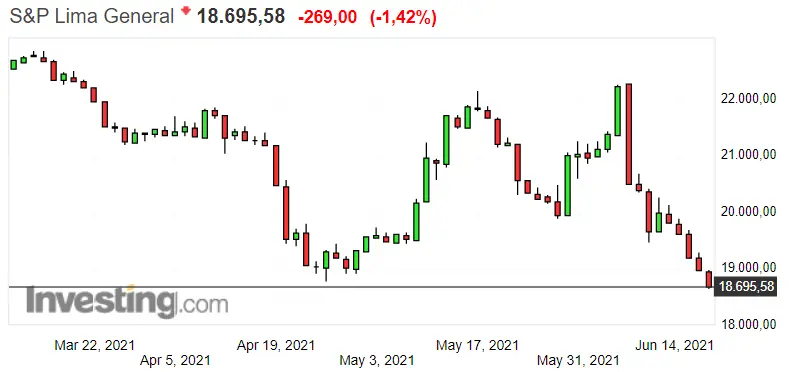Como ya hemos leído en el título, algo pasa con el índice peruano y es que hace bien poco su trayectoria alcista se veía interrumpida por una repentina e intensa bajada. Como podemos comprobar en el gráfico de abajo, el índice peruano se encuentra en estos momentos en un descenso del 1.42%, es decir de unos 269.00 puntos, dejando las cotizaciones del momento actual en 18695.58 puntos. Si buscamos el nivel de soporte del índice S&P Lima General, lo veremos en 16631.91 puntos, mientras que el nivel de resistencia lo podemos encontrar en 23276.93 puntos.