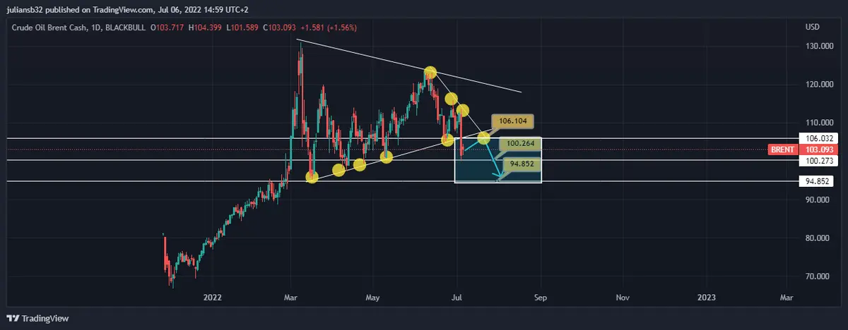 El precio rompe zonas claves de soporte y podría dirigirse a visitar esas zonas de rompimiento para seguir en fase bajista, el precio estaba formando una figura triangular con máximos cada vez menores y mínimos cada vez mayores, al romper la zona de soporte los participantes del mercado tienen más oportunidad de posiciones cortas, la zona de rompimiento puede actuar de resistencia además que se une con otra zona de resistencia al unir los máximos cada vez menores y esa zona ubica en los 106 usd en el crude Brent oil cash, en la sesión de hoy sube 1,54% y se ubica en los 103.11 usd, el precio podría perforar la zona de los 100 usd para dirigirse a la zona de los 94.852 usd como se observa en el siguiente gráfico: