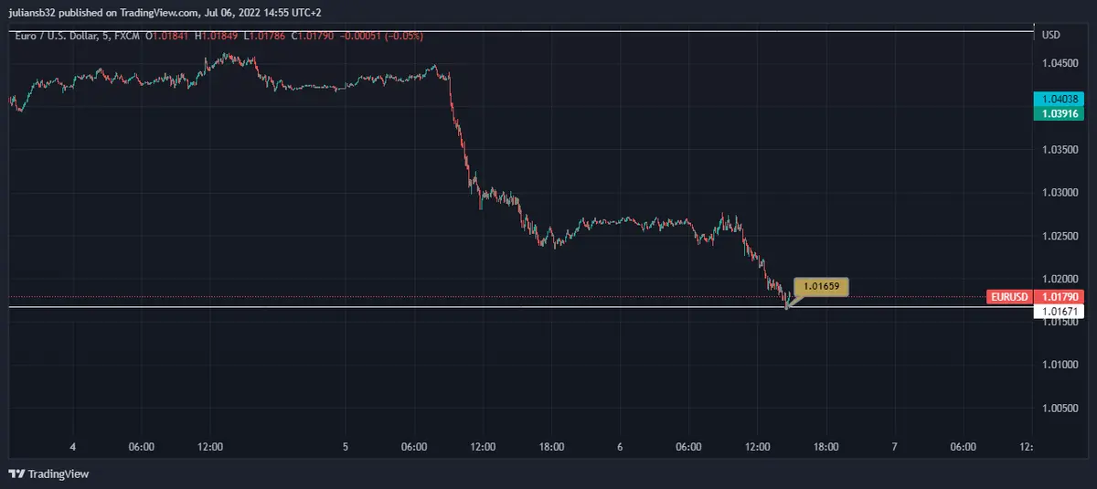 El euro se ha visto afectado por el conflicto entre Rusia y Ucrania que le desencadenara en una recesión económica más rápida que estados unidos, la gran incertidumbre por los precios de los hidrocarburos afectaron a la industria por los altos costos, la inflación está colapsando el sistema productivo y el euro pierde atractivo y ya se acerca a la paridad con el dólar americano, en la sesión del miércoles el euro frente al dólar americano marco un nuevo mínimo en los 1.01659.