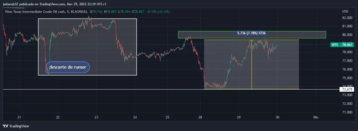 Una semana bastante volátil para el petróleo de referencia WTI, el cual comenzó la semana con grandes caídas por el temor del resurgimiento del covid, pero ya anda en territorio positivo y luchando por la zona de los 80 USD. La demanda todavía es débil, pero se genera una especulación futura sobre una posible reactivación económica en China, y levantamiento de algunas restricciones de Covid. Las medidas de Covid perjudican a las empresas chinas, las cuales son las que distribuyen en gran parte del mundo, y perjudica la cadena de producción mundial. En la sesión del lunes el petróleo de referencia WTI sube hasta la zona de los 78.69 USD, lo que representa una subida de 1.45 USD y una variación positiva de 1.88%, los próximos niveles a vigilar de resistencia son los 80 USD. Se necesitan noticias positivas en China para ayudar al petróleo, de haber una respuesta negativa del gobierno a las protestas, y seguir con restricción de Covid, es factible que el petróleo siga cayendo.