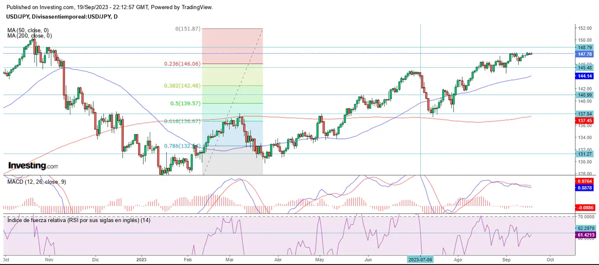 Mantenemos el soporte en los 145.48, apenas por debajo del 23.60% de Fibonacci.
