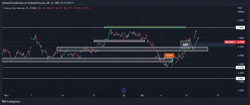 La especulación en el gas natural está aumentando a medida que entra el invierno en Europa, en la sesión de hoy, el precio del gas natural se ubica en la zona de los 6,716 USD, lo que representa una subida de +0,471 USD y una variación positiva de +7,54%. El precio del gas natural abrió con un gap alcista en la sesión de lunes, y las próximas zonas a vigilar de soporte sería el cierre del gap en los 6.414 USD, donde los participantes del mercado pueden retomar compras.