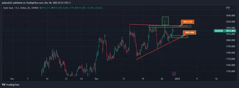 El precio del oro en el mes de diciembre llego a un máximo en los 1.833 USD, el precio en la sesión actual se encuentra en la zona de los 1.815 USD, y el precio podría encontrar soporte en los 1.805 USD y resistencia en los 1.822 USD.