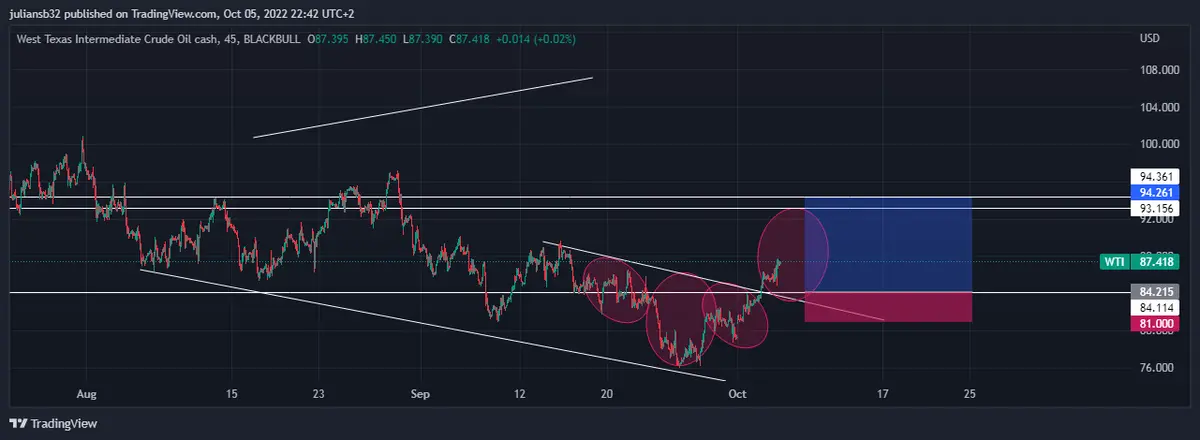 Gráfico del petróleo de referencia WTI en temporalidad de 45 minutos fuente tradingview