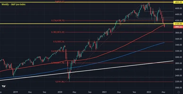 El S&P 500 está disputando una ruptura por debajo de su promedio móvil de 100 semanas (línea roja) y el nivel de retroceso de Fibonacci de 38,2 @ 3815 es el siguiente nivel de soporte plausible. Eso apunta a otra caída potencial de más del 4% en el índice.