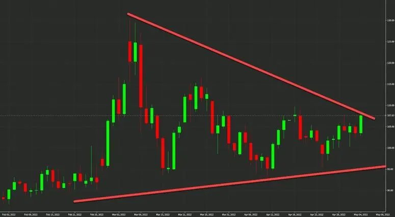 Sin embargo, el petróleo está a un paso del mejor cierre diario desde el 25 de marzo. Más importante aún, este patrón de cuña que se estrecha está en peligro de romper al alza. Me gustaría ver un aumento por encima de los $110 para confirmarlo, pero este es un gráfico que merece una observación muy cercana. Los informes sugirieron que la UE está a punto de prohibir el petróleo ruso con un plazo de seis meses y podría hacer el anuncio mañana.