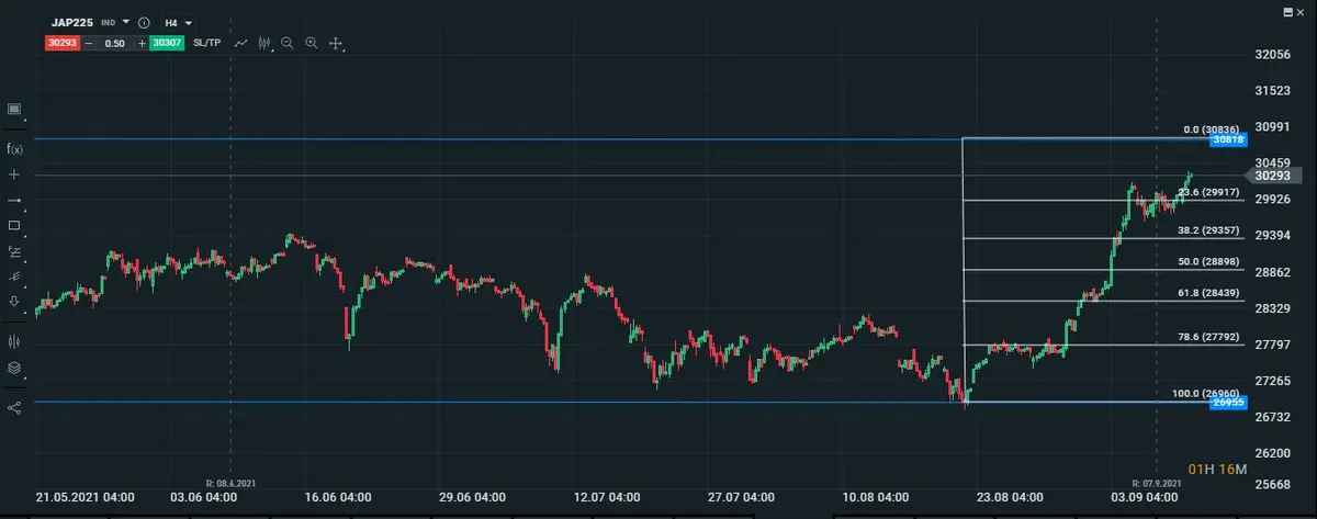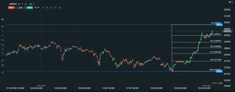 Por la parte del índice Nipón vemos en su gráfico intradiario, que está a nada de testear sus máximos históricos, de llegar a conseguirlos, lo que se esperaría que sucediera sería que el precio del índice rote a la baja , de darse estos movimientos estaríamos esperando que el precio se detenga en el nivel 38 de fibonacci, y en el cuál esperamos el índice retome la senda alcista, e inclusive pueda generar nuevos máximos.