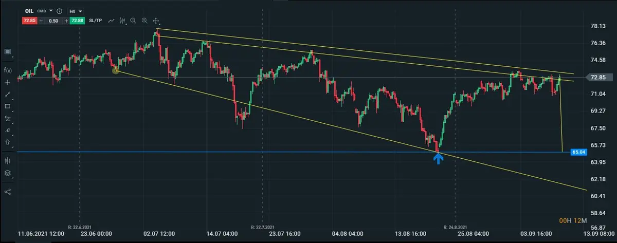 Tampoco podemos ignorar la tendencia que actualmente tiene el pertróleo y que la podemos apreciar en su gráfico intradiario(4H), vemos que su tendencia de máximos decrecientes se mantiene intacta, y si trazamos sus minimos podríamos estar ante una formación que se conoce como megáfono, aunque no está del todo bien formado,y valorando dónde se encuentra el precio en estos momentos, existiría la posibilidad de que el petróleo sufra una corrección bastante llamativa la próxima semana.