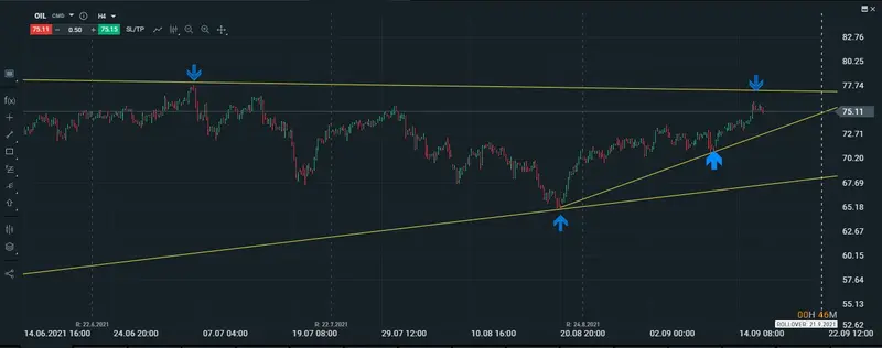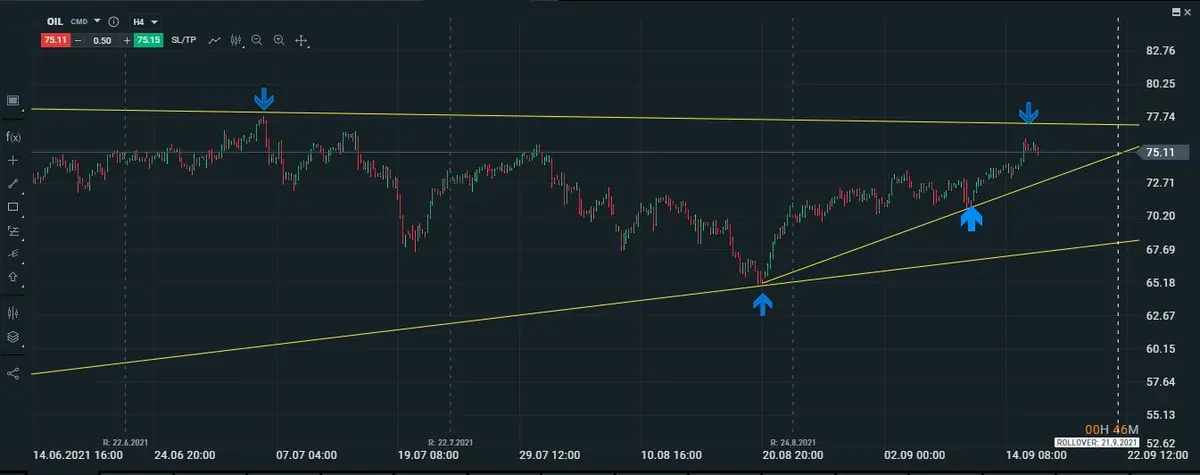 Para que podamos ver un cambio de tendencia nos iremos a un gráfico de 4H, y como se puede apreciar en la estructura del petróleo tendríamos que ver superada la tendencia principal de la que hemos estado comentando y que se encuentra cercana a los 80 puntos, de conseguir el precio del petróleo batir dicha tendencia esperaríamos hasta el toque del próximo techo que se encuentra en los 86 puntos.
