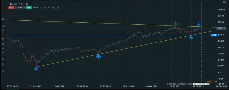 En un gráfico diario podemos apreciar mucho mejor el movimiento que ha estado realizando el petróleo, si trazamos sus directrices, podemos observar que el precio del petróleo tiene unos mínimos y máximos crecientes, pero también podemos observar que los máximos han llegado a testear la gran línea de tendencia bajista, y en la cuál el precio rompe a la baja llegando a detenerse en los 64 puntos, para luego volver a retomar su senda alcista, dicho movimiento alcista en un principio parecería estar llegando a su fin, ya que como hemos dicho antes el precio estaría a nada de volver a testear la línea de tendencia principal y en la cuál esperamos el precio no pueda romper.