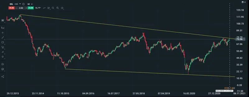 Vamos a comenzar viendo un gráfico semanal para que podamos apreciar su línea de tendencia bajista de largo plazo en el petróleo, y también vemos de que el precio del petróleo está a punto de testear dicha línea de tendencia, de darse esta situación lo que es lógico es que el petróleo comience a hacerlo mal, pero para confirmar dichos movimientos tendríamos que esperar que el precio nos dé indicios de cuáles serán sus próximos movimientos.