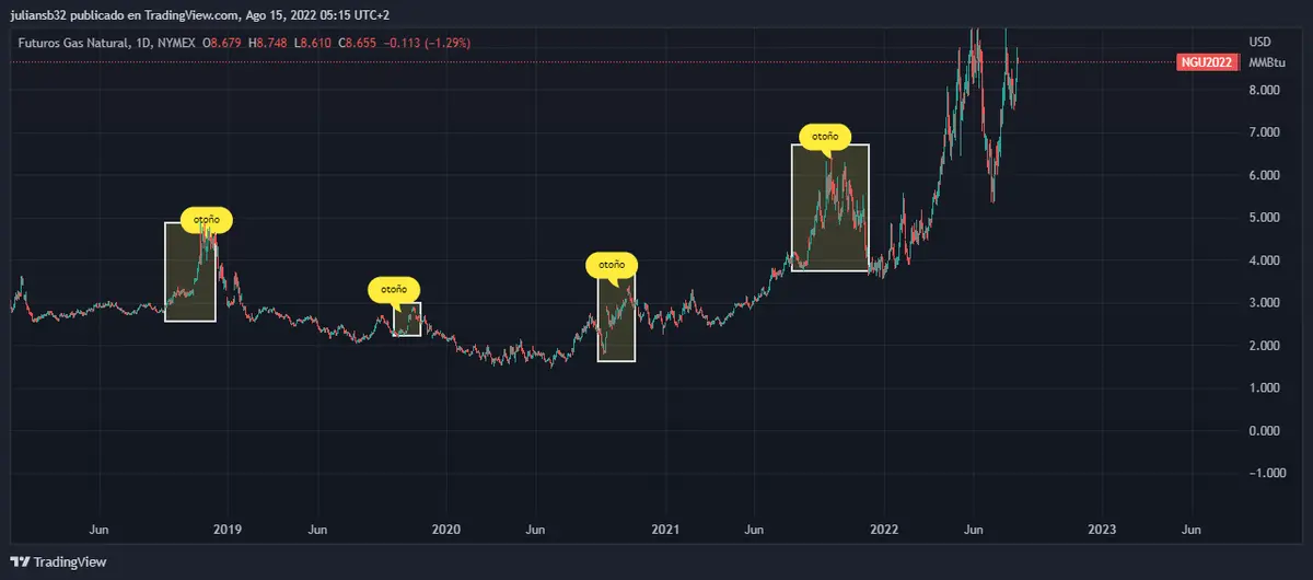 En septiembre comienza la temporada de otoño y los especuladores comienzan a comprar gas natural para sacar ventaja antes de que llegue la temporada de invierno, es lo que se ha observa en los años anteriores y genera oportunidades de compras con la variable que limita la oferta, es un año muy malo para Europa y que puede generar una recesión fuerte en los próximos meses, en el siguiente grafico se observa en los últimos 3 años como en la temporada de otoño es donde el gas natural fluctúa positivamente :