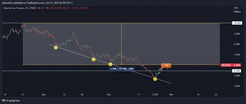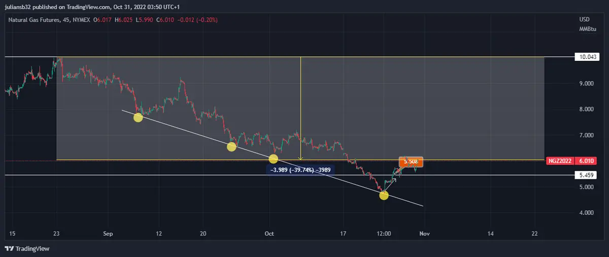 En el mes de agosto el precio del gas registro un máximo para este 2022, se ha venido corrigiendo un 39% hasta la fecha de hoy, actualmente los futuros de gas natural se ubican en la zona de los 6.01 USD.