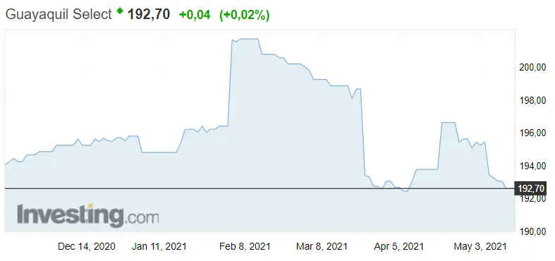 Como vemos en el gráfico de abajo, las cotizaciones del índice Guayaquil se dirigen en línea alcista con una situación actual de 192.70 puntos. Lo que iba sucediendo desde hace un tiempo era una situación en la que de los 196.68 puntos de resistencia, que se mantenía entre los días 19 y 22 de abril, el índice bajaba hacia los 192.50 puntos de soporte, que origina las subidas del momento actual. Es entonces cuando se desencadena la subida de las cotizaciones del índice Guayaquil que concluye en el momento actual. Veamos las pequeñas subidas del momento actual, que son de un 0.02%, es decir; de 0.04 puntos.