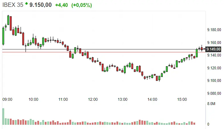 Las cotizaciones del índice español Ibex 35 se van manteniendo en unos 9149 puntos, se trata de una trayectoria de subida de un 0.05%, es decir, un ascenso de 4.40 puntos, que sigue manteniendo el índice español en verde. A la situación actual le precede una subida muy reciente que empujaba el Ibex 35 hacia niveles vistos en el nivel de resistencia, pero que están aún muy lejos de ser alcanzados. Buscando los niveles de soporte y resistencia, encontraremos el nivel de resistencia exactamente en los 9203.90 puntos, mientras que el de soporte lo vemos en 9099.55 puntos.