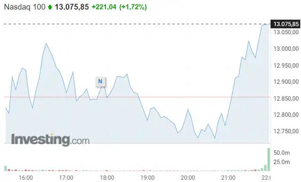 El índice Nasdaq 100 comenzaría el 2 de mayo con una apertura al valor total de $12.872,12 a las 15:30 pm. Y cerraría con la suma de $13.075,85 a las 22:00 pm.