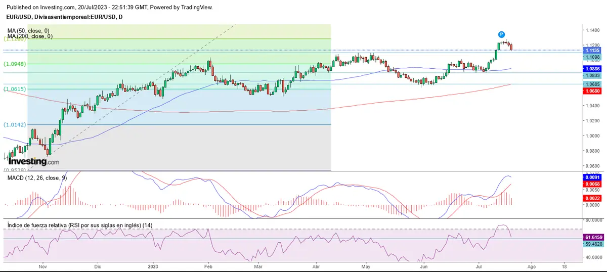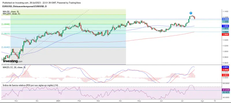 El EUR/USD también dio un giro a la baja tras intentar superar 38.20% de Fibonacci, cotizando en la apertura del viernes hasta los 1.1135.