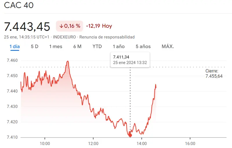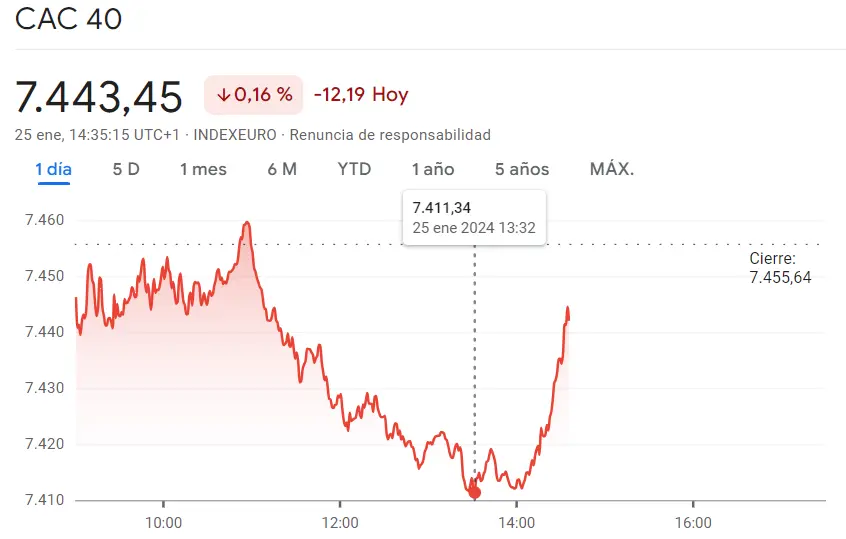 Gráfico de las cotizaciones de índice CAC 40 en un esapacio de tiempo de un día