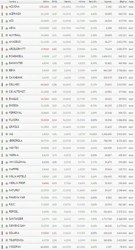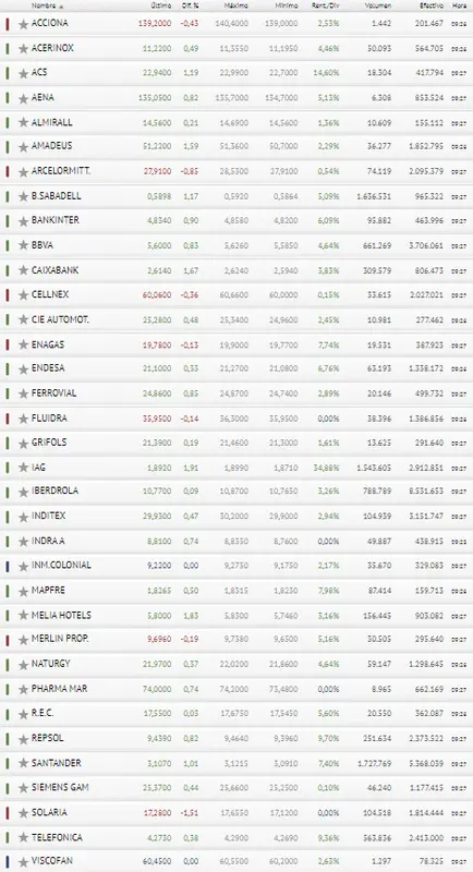 Nuestra atención la captan las 35 acciones que componen el Ibex, entre las cuales encontramos; Acciona, Acerinox, Grupo ACS, Aena, Almirall, Amadeus IT Group, ArcelorMittal, Banco Sabadell, Banco Santander, Bankinter, BBVA, CaixaBank, Cellnex Telecom, CIE Automotive, Enagás, Endesa, Ferrovial, Fluidra, Grifols, IAG, Iberdrola, Inditex, Indra Sistemas, Inmobiliaria Colonial, Mapfre, Meliá Hotels International, Merlin Properties, Naturgy, PharmaMar, Red Eléctrica Corporación, Repsol, Siemens Gamesa Renewable Energy, Solaria Energía y Medio Ambiente, Telefónica y Viscofan.