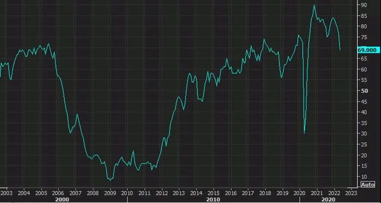 Las ganancias de Home Depot y los comentarios de la gerencia de hoy fueron muy optimistas sobre la vivienda y el gasto en vivienda de EE. UU. Pero estos números resaltan algunas de las conversaciones anecdóticas recientes de que ha habido una fuerte caída en el tráfico. Si eso es una señal de normalización de un mercado inmobiliario extremadamente caliente o una reversión pendiente en los precios de la vivienda es un debate animado. Esta es la peor lectura desde junio de 2020 y coloca el índice por debajo de los niveles de enero de 2020 (antes de la pandemia), aunque sigue siendo elevado sobre una base histórica.