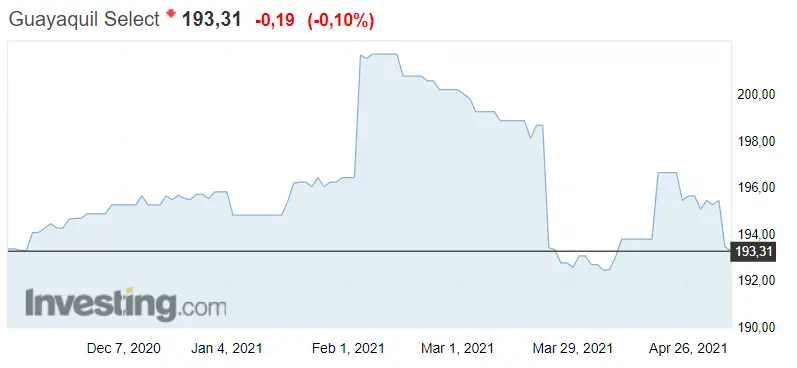 Como vemos en el gráfico de abajo, las cotizaciones del índice Guayaquil se mantienen con intensas bajadas durante los últimos días ya del mes de mayo, con una situación actual de 193.31 puntos. Lo que iba sucediendo desde hace un tiempo era una situación en la que de los 196.68 puntos de resistencia, el índice bajaba al actual. Si buscamos el valor del nivel de soporte, encontraremos el de 192.50 puntos. En el momento actual lo que vemos son bajadas del 0.10%, es decir; de 0.19 puntos.