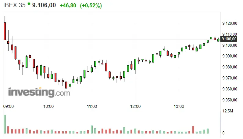 Las cotizaciones del índice español Ibex 35 se van manteniendo en unos 9106 puntos, se trata de una trayectoria de subida de un 0.52%, es decir, un ascenso de 46.80 puntos, que mantiene el índice español en verde. A la situación actual le acompañan los niveles de soporte y resistencia. El nivel de soporte lo veremos en unos 9060.25 puntos, mientras que el de resistencia pertenece a unos 9126.94 puntos.