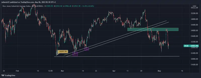 Grafico del DJI en temporalidad de 15 minutos fuente- tradingview