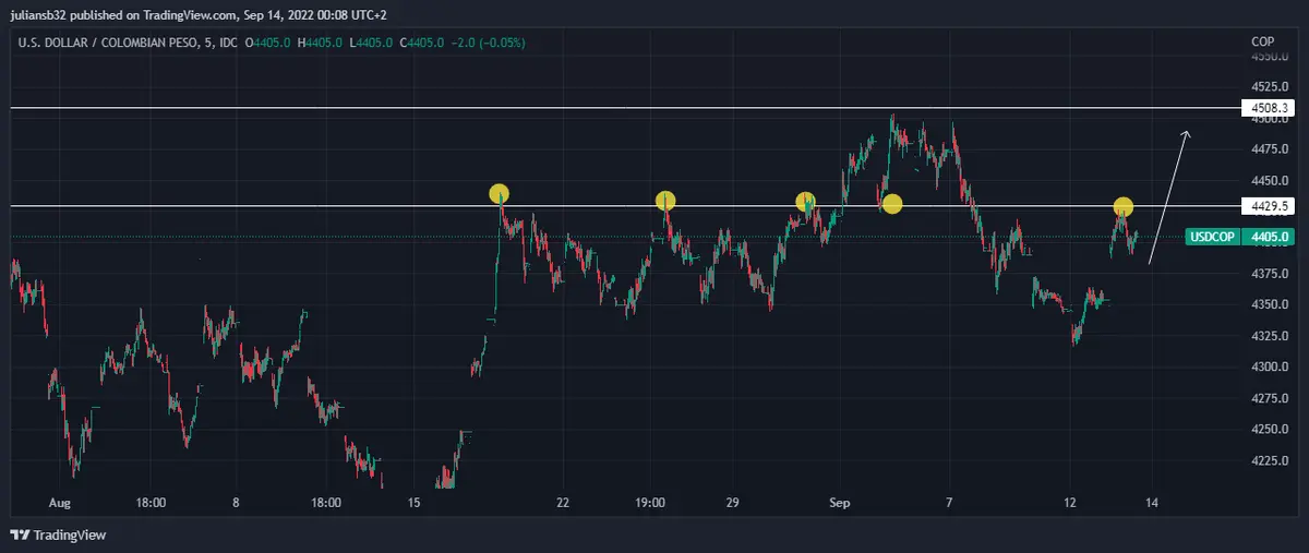 Grafico del dólar frente al peso colombiano en temporalidad de 15 minutos fuente tradingview