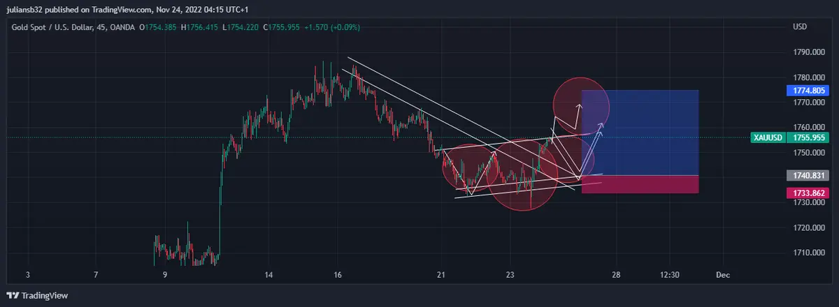 Desde una perspectiva fundamental, el oro favorece a compras al estar en una corrección los rendimientos de los bonos, puesto que se puede sustentar en varios periodos de tiempo que existe una correlación estrecha. La estructura del oro en el corto plazo está formando un HCH, el cual favorece a los compradores, y de generarse correcciones, el precio podría entrar en una acción del precio en la zona de los 1740 USD a 1742, la cual es la zona de soporte del hombro de la figura.