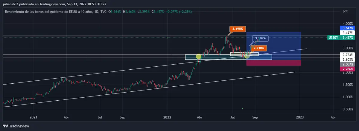 El dato de inflación para el mes de agosto genero gran volatilidad ya que se esperaba un dato mejor y al subir las probabilidades de una FED agresiva , los rendimientos de los bonos de estados unidos a 10 experimentaron una gran subida, en la sesión actual se ubica en los 3,43 % con una variación positiva para el miércoles de 2,29%, la próxima semana podría generarse gran volatilidad en los bonos con la reunión de la reserva federal, el mercado está anticipando desde ya que la FED será agresiva.