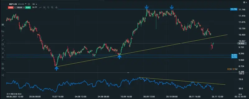 Si al final de la jornada el precio consigue cerrar por encima de los 10 puntos, entonces esto podría ser una buena señal para pensar de que los movimientos en el gráfico de Repsol son los de un movimiento alcista que busca cerrar el gap. Si por el contrario lo que vemos es que el precio de la acción no consigue superar los 10 puntos, entonces reforzaría la idea de que todavía podríamos esperar giros a la baja que llevarían al precio a testear los suelos que se encuentran en los 9.21 puntos. Tanto como si se diera el caso de que el precio se gira al alza, como si también se da la vuelta para seguir corrigiendo, en ambos casos tenemos que esperar la confirmación del indicador del RSI, como se puede observar, de momento los movimientos del RSI no han conseguido superar la línea que une sus máximos decrecientes, lo que nos confirma, de que todavía no es un buen momento para posicionarse alcista en la acción de Repsol.