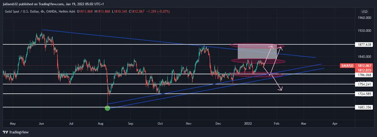 En el oro desde el punto de vista estructural el precio está generando una consolidación en el rango aproximadamente de los 1785 usd a 1827 usd, esta consolidación de romperse seria para ir en búsqueda de su cuerpo e ir por los niveles de noviembre en la zona de los 1878 usd y de romper los niveles de 1785 usd la cual es una zona interesante de soporte y de estructura alcista, el precio podría ir a niveles de los 1725 usd, como se observa en la siguiente gráfica: